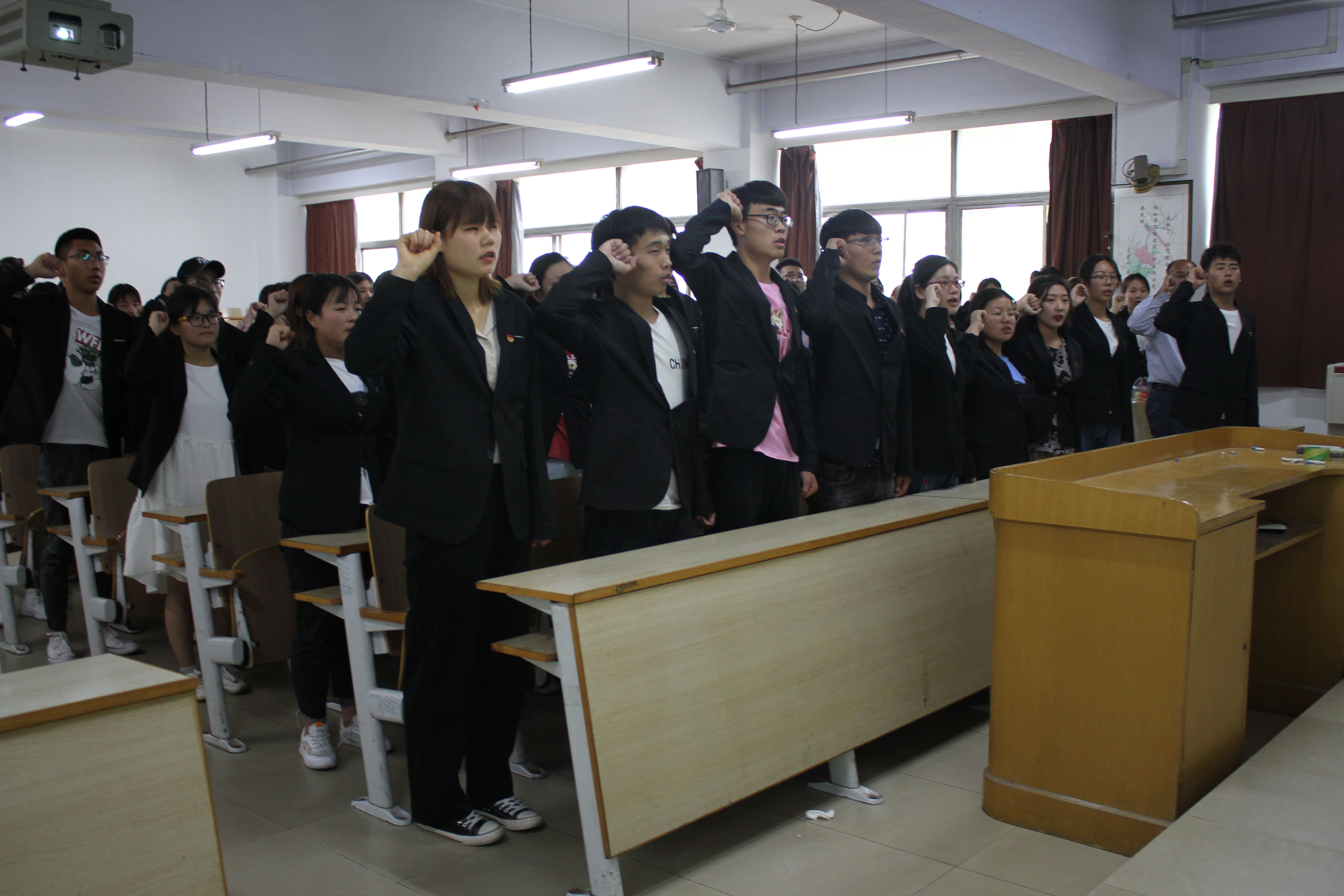 接下来由老团员代表给新团员佩戴象征着荣誉和使命的团徽。新团员胸带团徽,面向团旗,在领誓人带领下举起右拳庄严宣誓,所有老团员也共同重温誓词。洪亮坚定的青春誓言,表达了同学们对共青团组织的无限向往和为团组织增光添彩的豪迈激情。